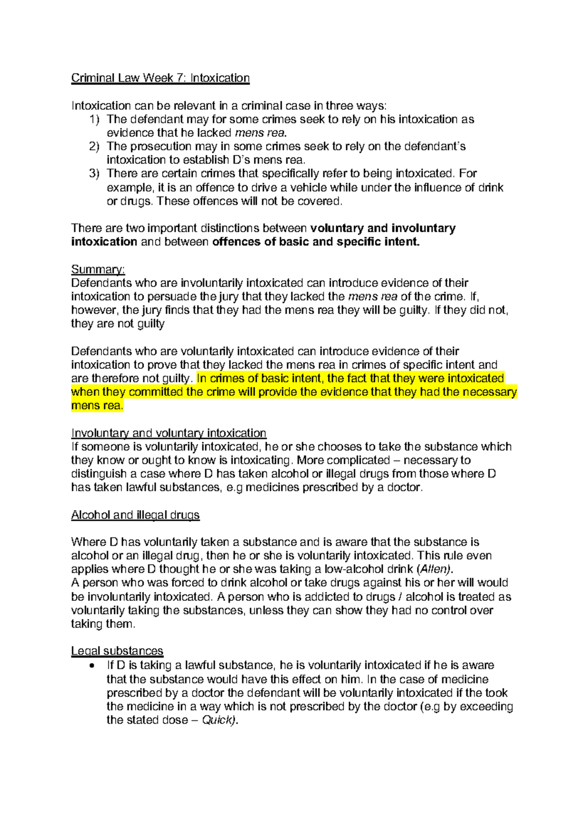Criminal law intoxication notes - Criminal Law Week 7: Intoxication ...
