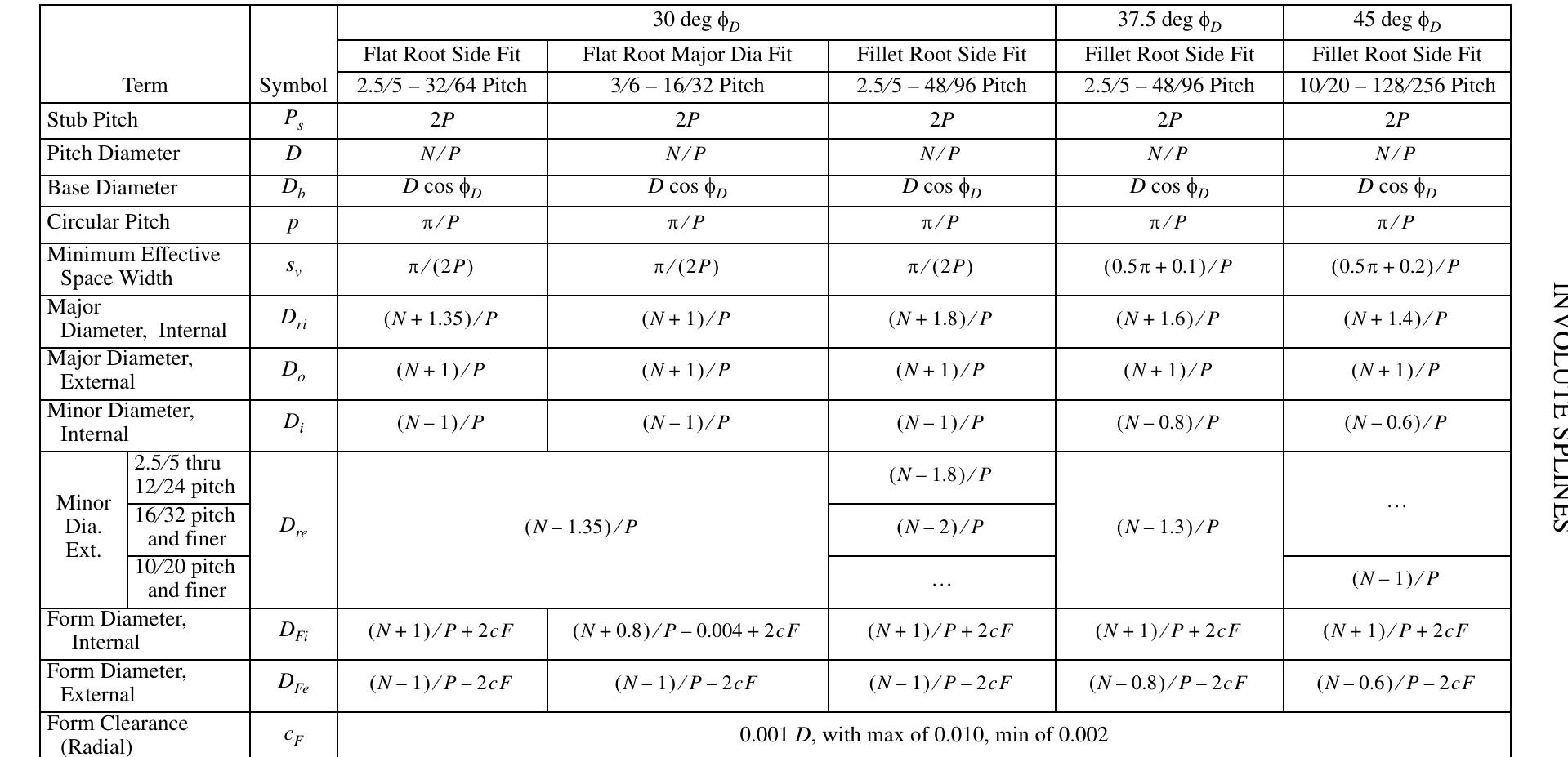 Involute Spline Calculation Formulas in English Units
