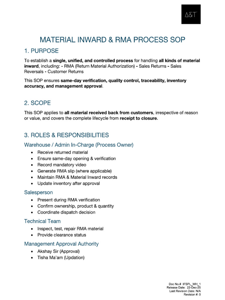 RMA & Material Inward Process | PDF