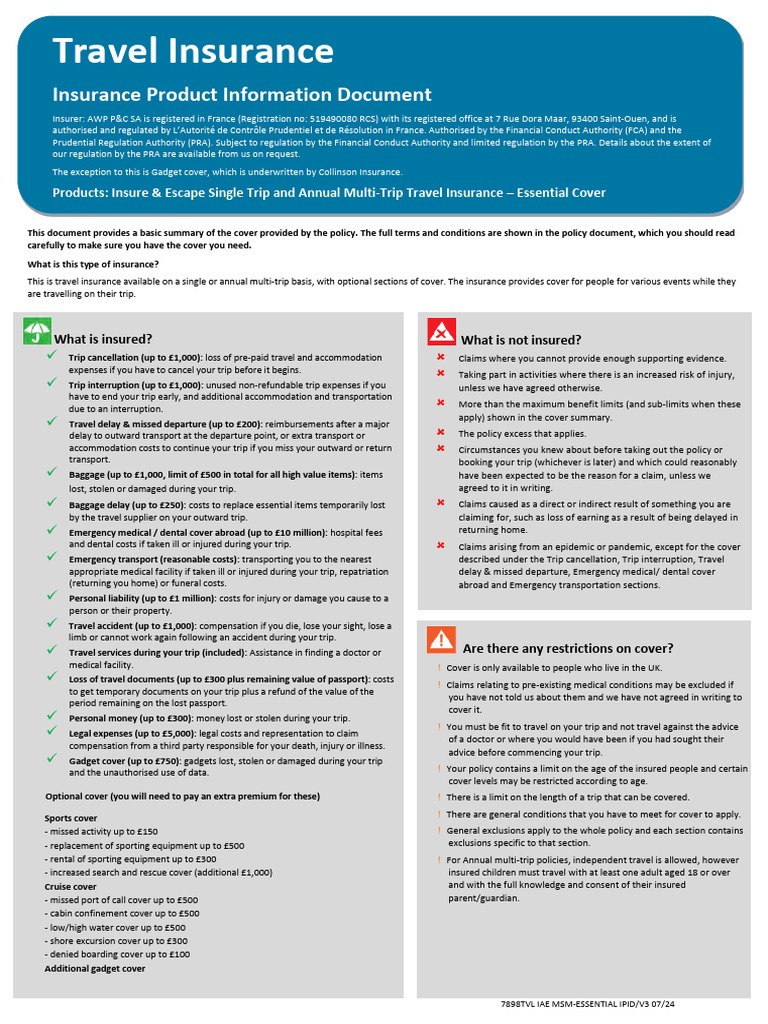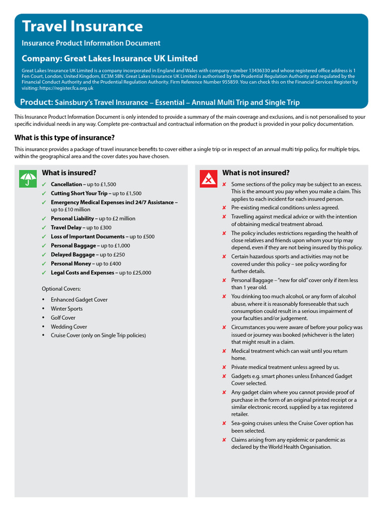 Travel Insurance: Insurance Product Information Document | PDF ...