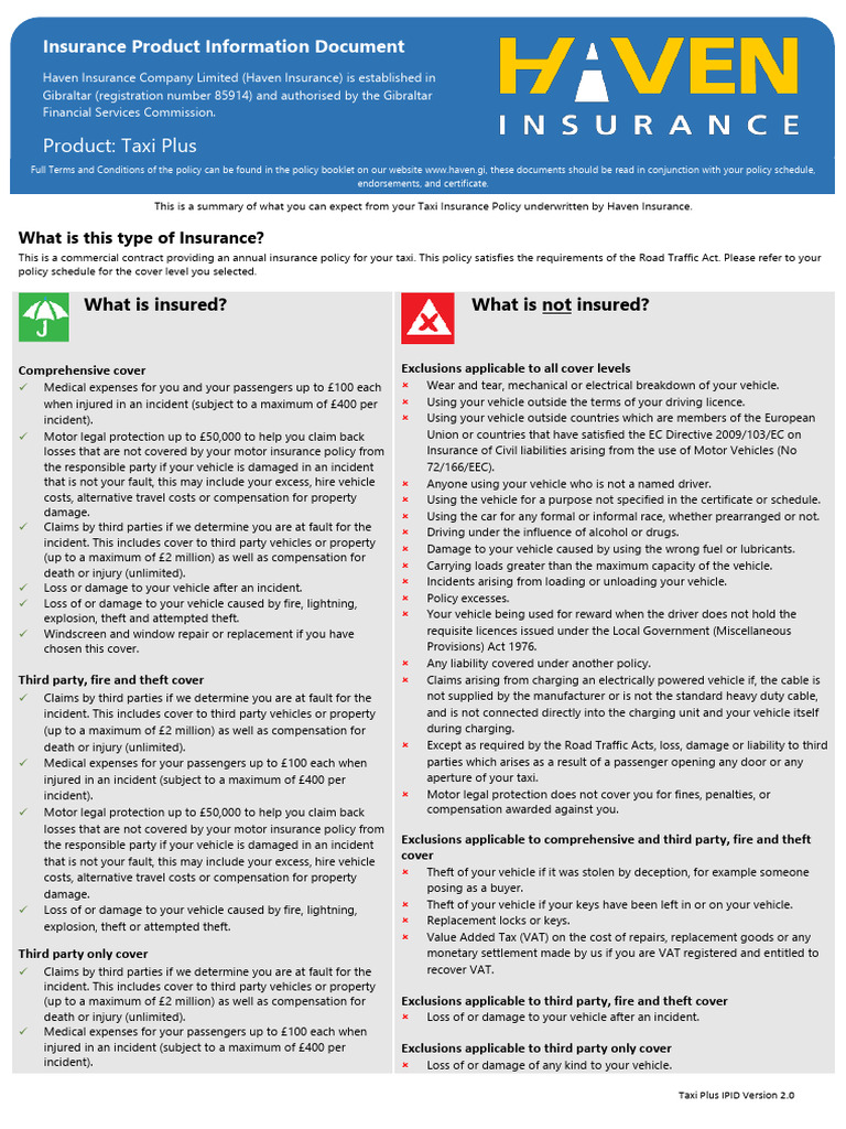 IPID Taxi Plus All Cover Levels | PDF | Vehicle Insurance | Insurance