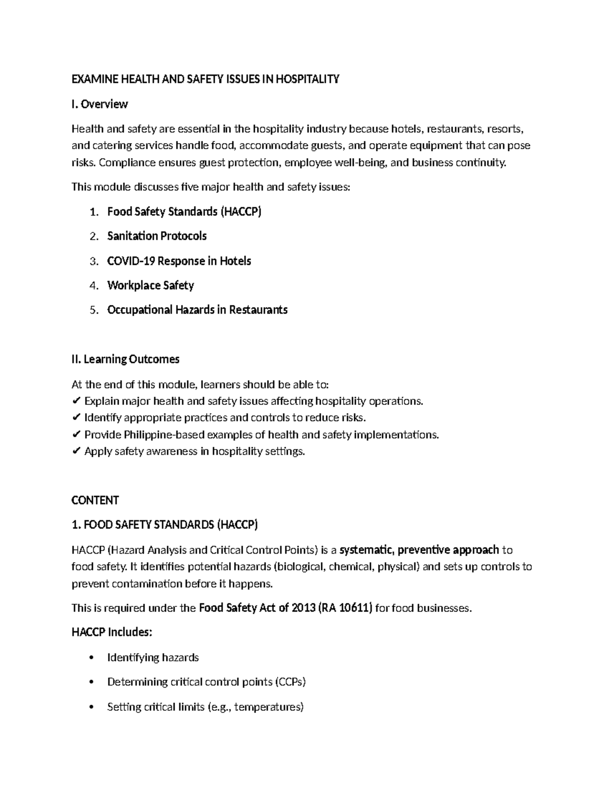 HOSP 101: Health & Safety Issues in Hospitality Overview - Studocu