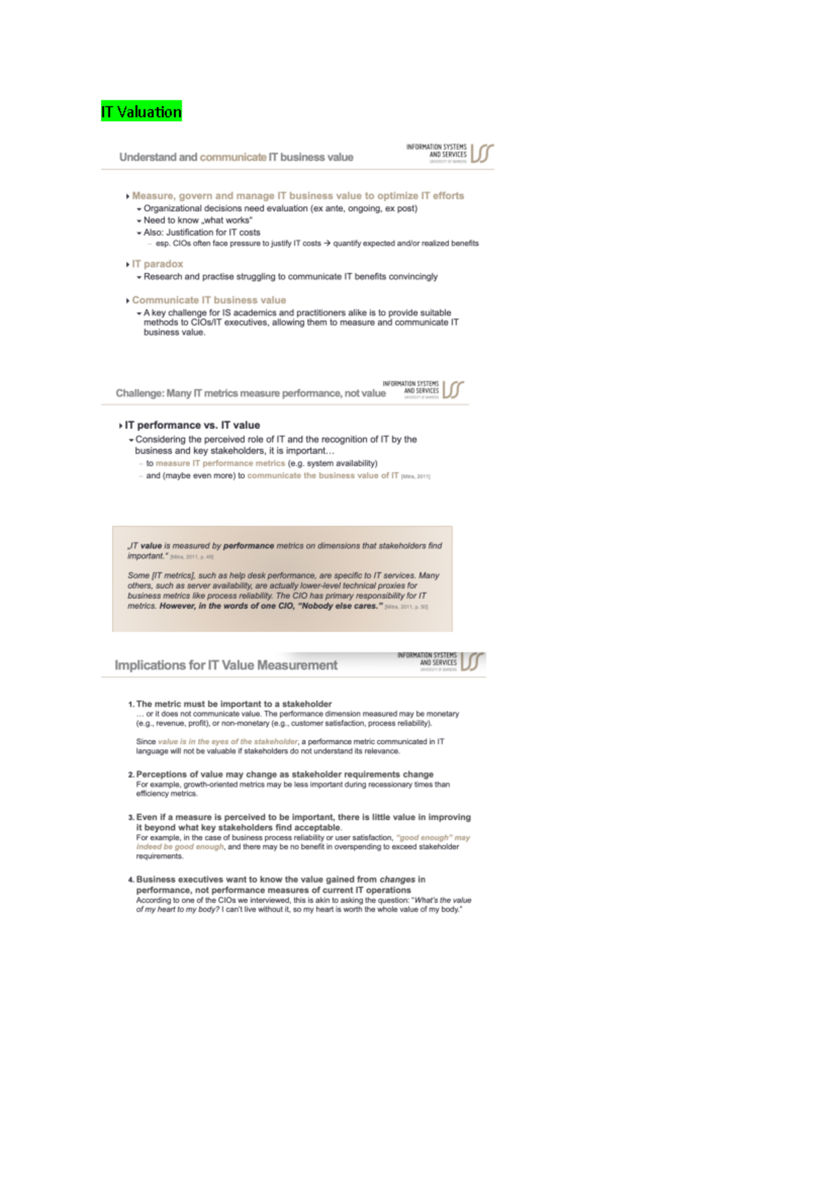 IT Valuation - ISDL-ISS3-M: IT-Wertschöpfung - IT Valua(on - Studocu