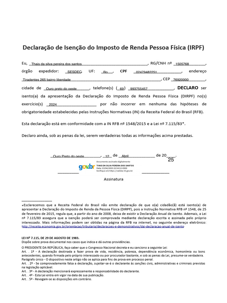 Declaracao de Isento de Imposto de Renda de 2025 Assinado | PDF ...