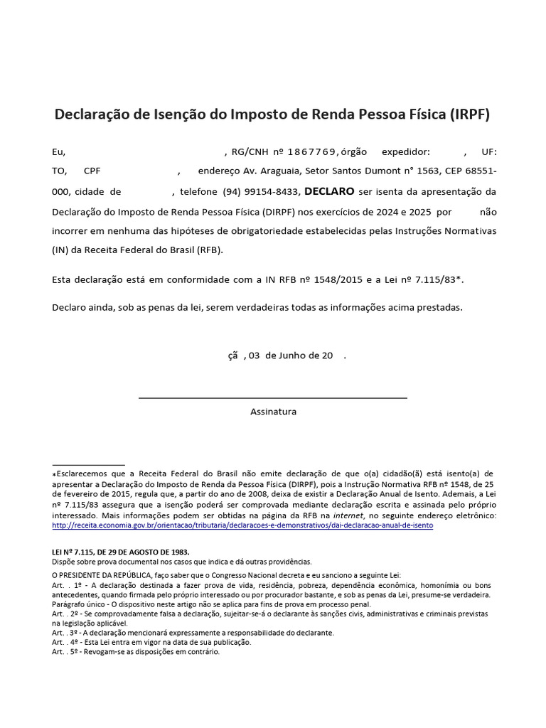 Modelo De Declaracao De Isento De Irpf Brasil