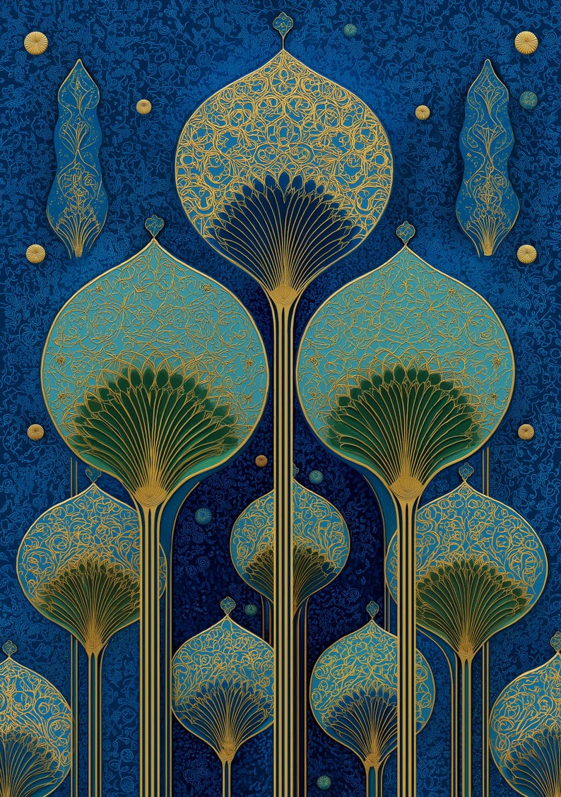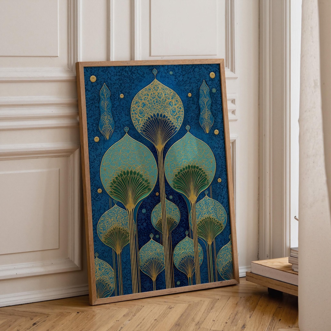 Islamic Botanical Art Print, Blue Gold Arabic Pattern, Boho Floral ...