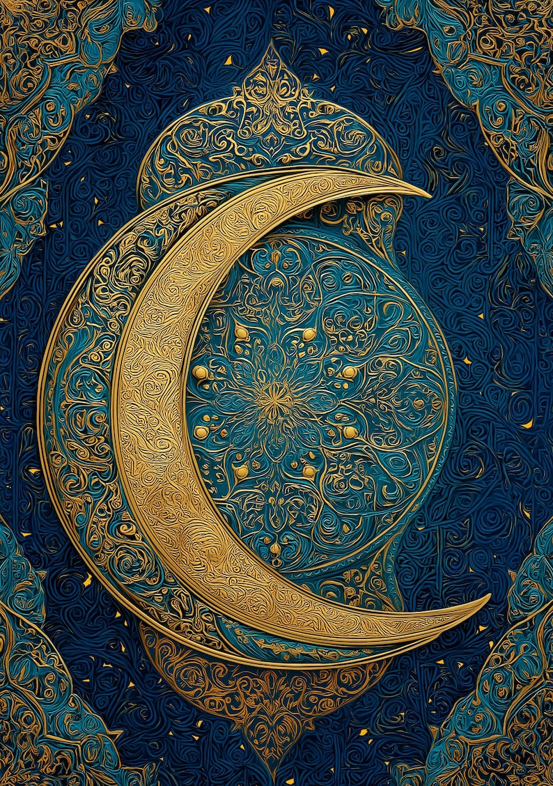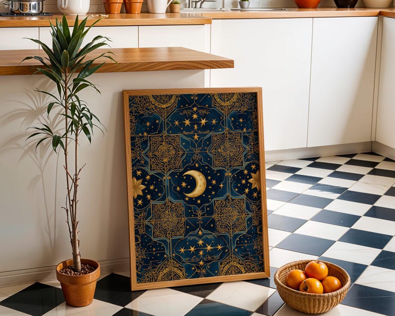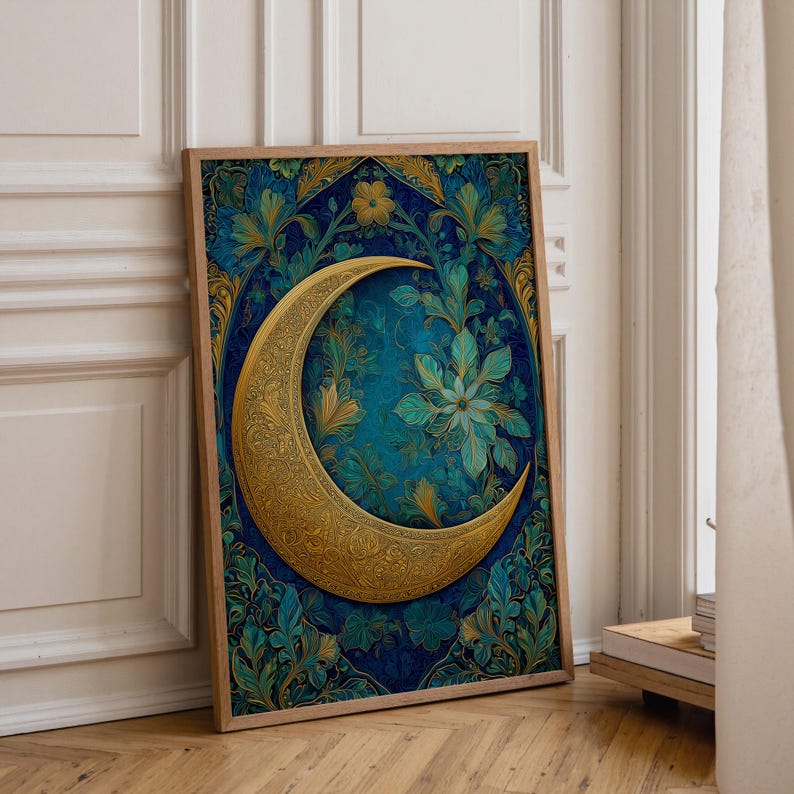 Islamic Crescent Moon Art, Gold Blue Arabic Pattern Print, Ramadan Boho ...