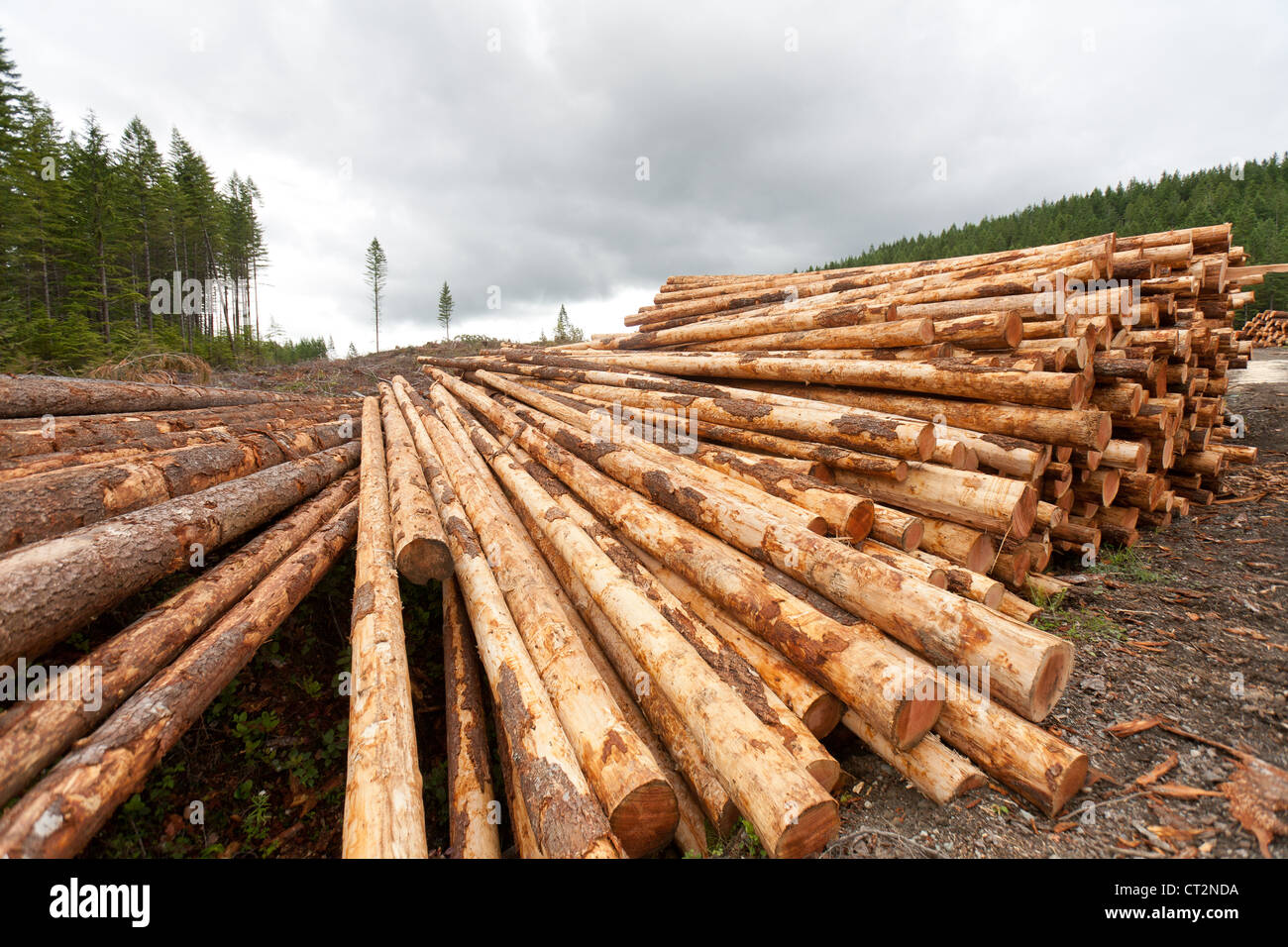 Timber log stack by a dirt road in a clear cutting area Stock Photo - Alamy