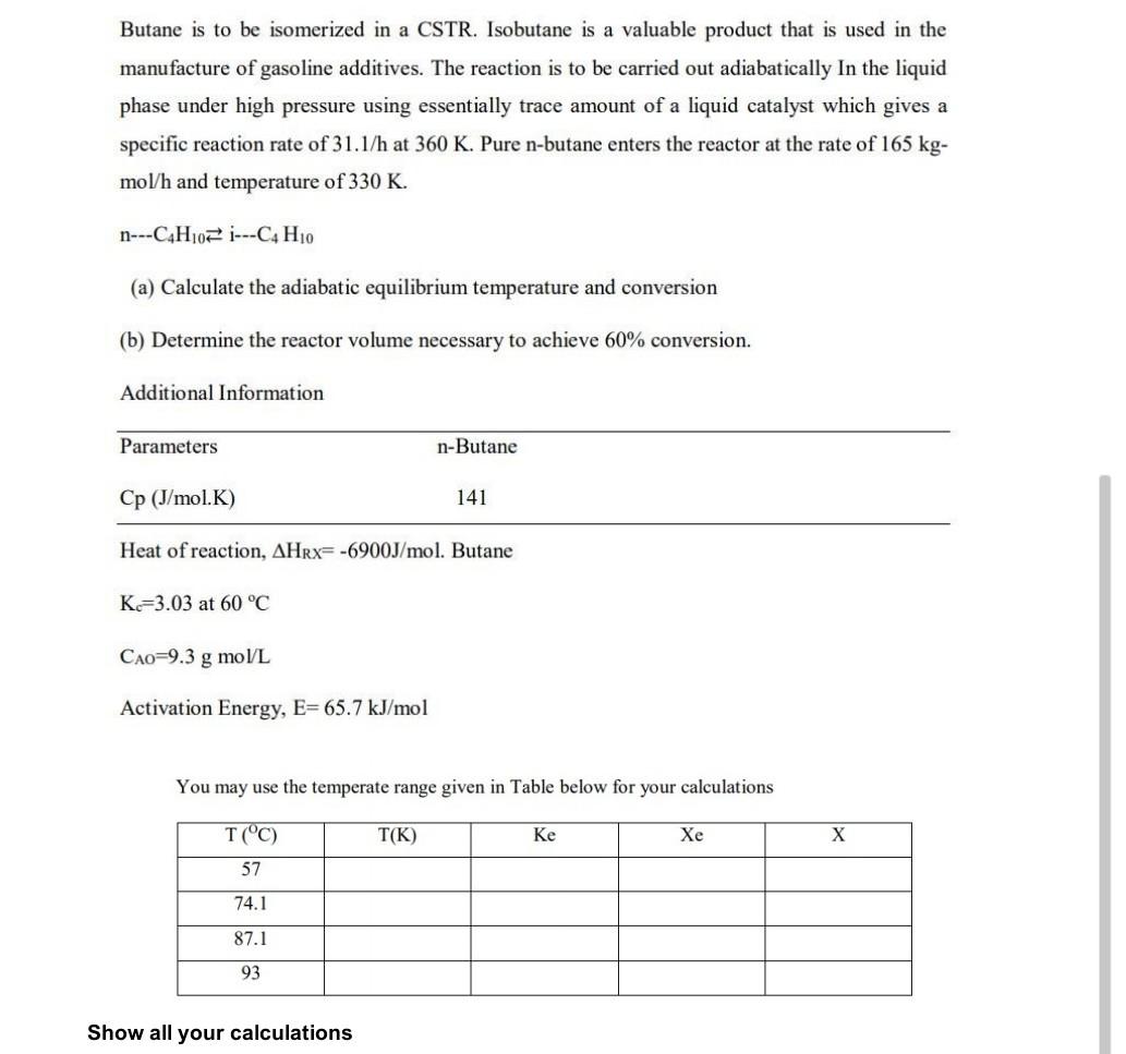 Solved Butane is to be isomerized in a CSTR. Isobutane is a | Chegg.com
