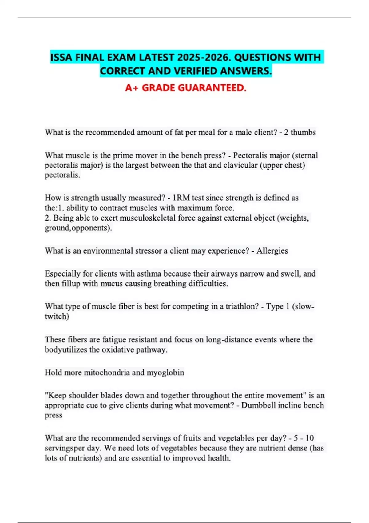 ISSA QUESTIONS ALL WITH 100% CORRECT ANSWERS - Exercise Specialist ...