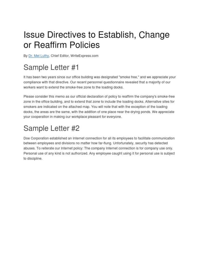 Issue Directives To Establish, Change or Reaffirm Policies: Sample ...