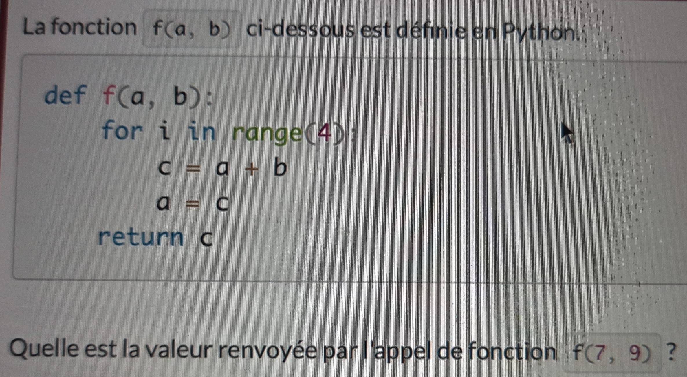 Résolu :La fonction f(a,b) ci-dessous est défnie en Python. def f(a,b ...