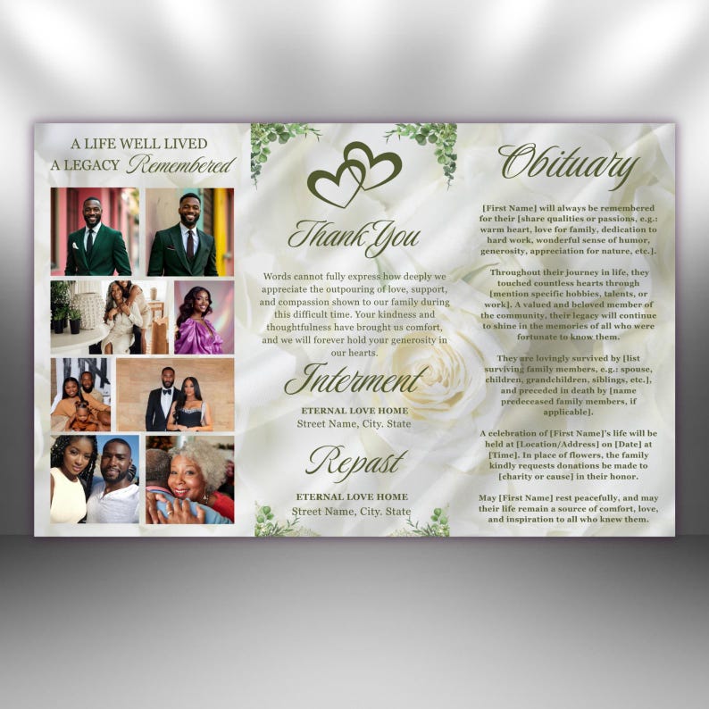 White and Green Roses Funeral Program: Trifold Memorial Template (17x11 ...