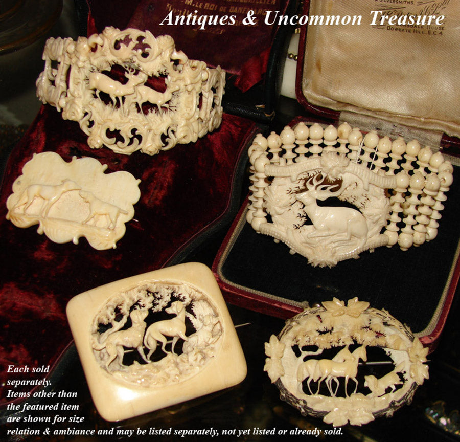 RARE Antique c.1830 to Early Victorian Carved Ivory Brooch w 3 Dogs, H ...