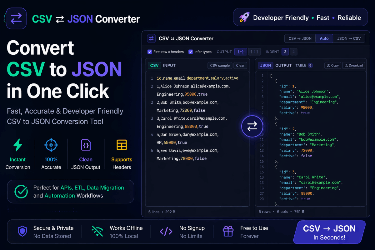CSV to JSON Converter — JSON to CSV Online Free | Table Preview | DevTools
