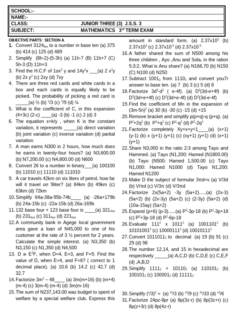 JSS3 Term 1 Math Exam Questions | PDF | Numbers | Rational Number