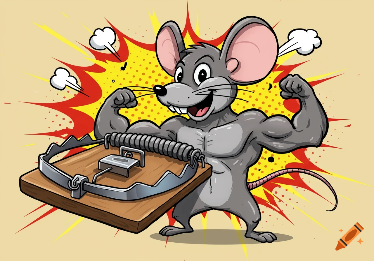 A muscular, grinning cartoon mouse flexes biceps, holding open a ...