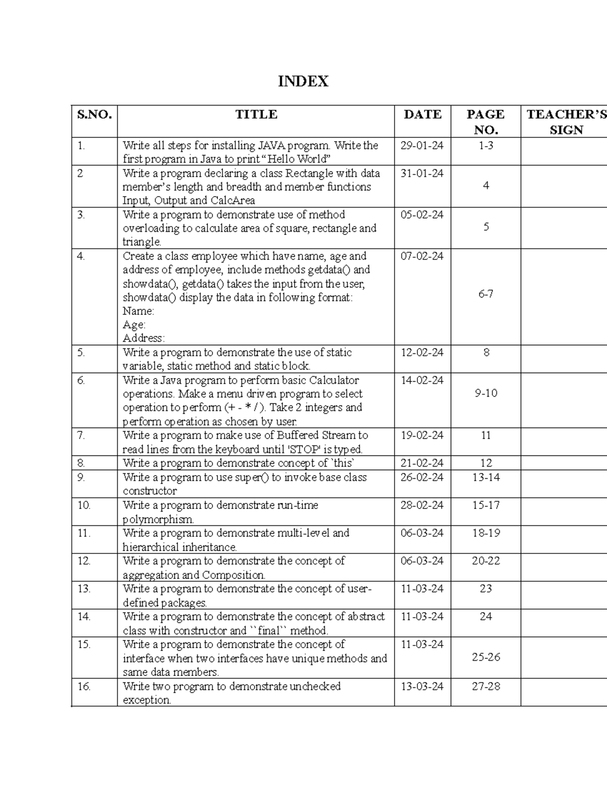 Index java jas - notes - INDEX S. TITLE DATE PAGE NO. TEACHER’S SIGN 1 ...