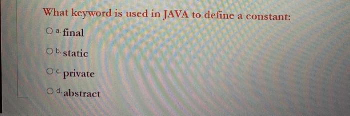 Solved What keyword is used in JAVA to define a constant: a. | Chegg.com
