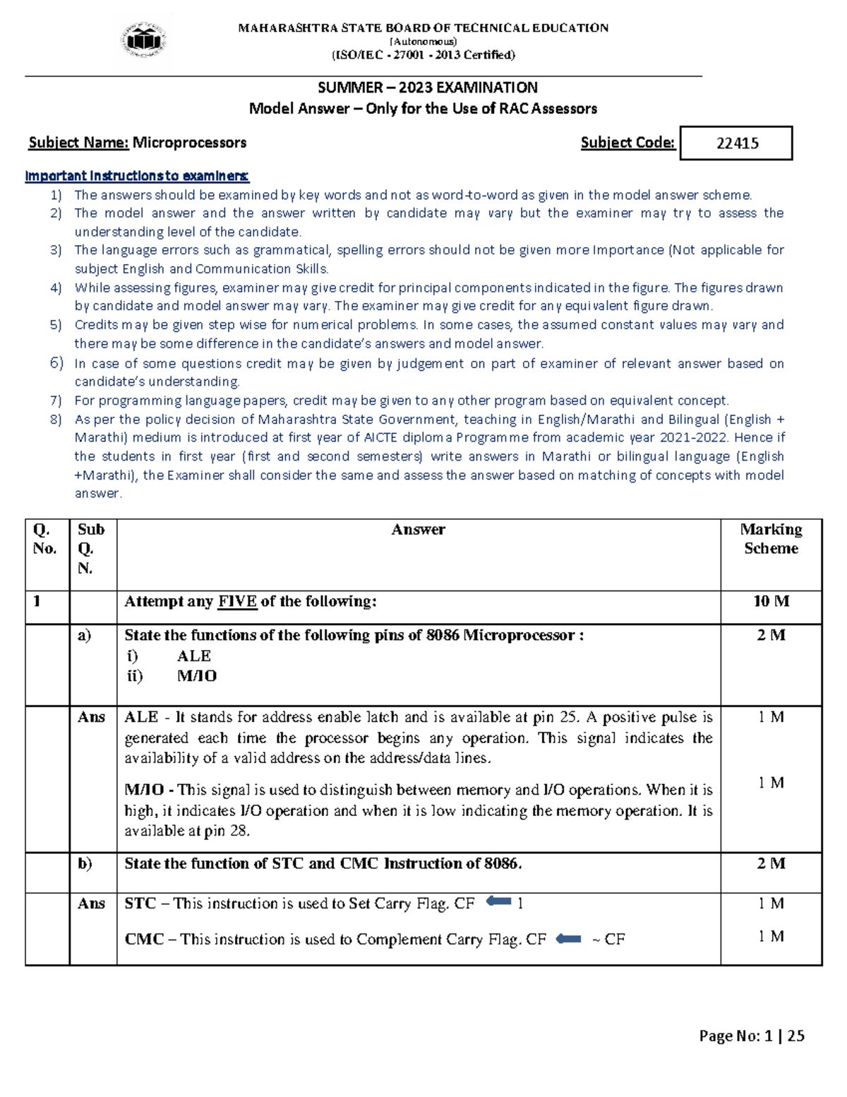 22415 Microprocessors Summer 2023 Model Answer for RAC Assessors - Studocu