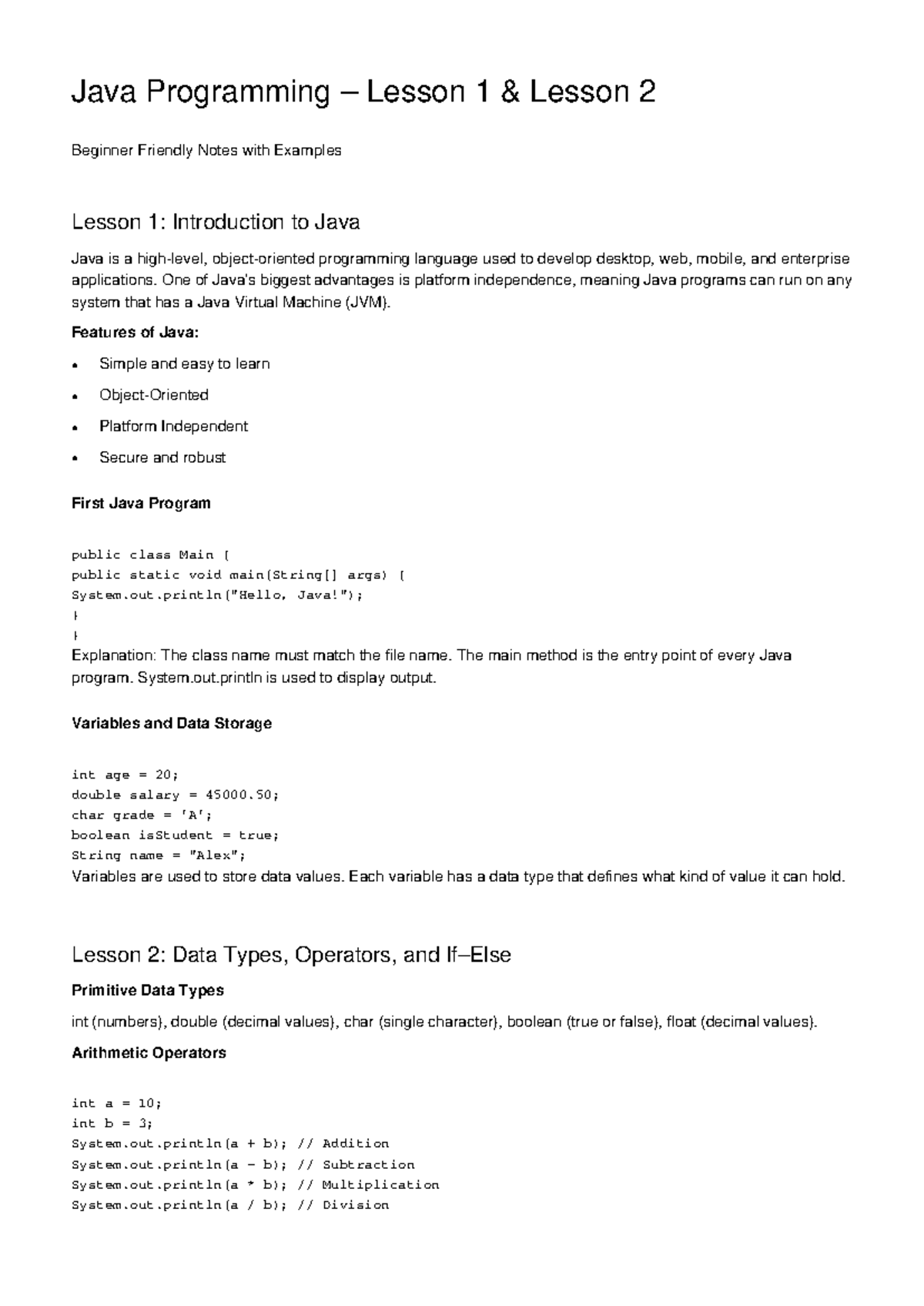 Java Programming Lessons 1 & 2: Beginner Notes & Examples - Studocu