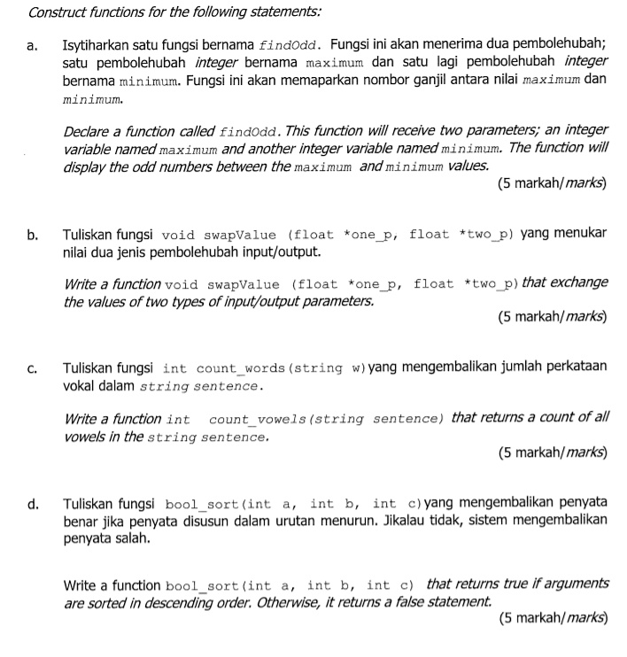 Construct functions for the following statements: a. Isytiharkan satu ...