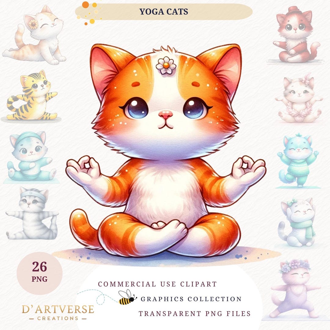 Watercolor Yoga Cats Clipart Bundle Cute Kitten PNG Digital Download ...