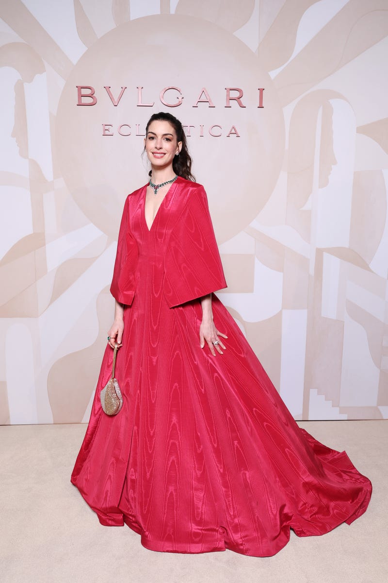 Anne Hathaway is a vision in a red Valentino gown and cascades of ...