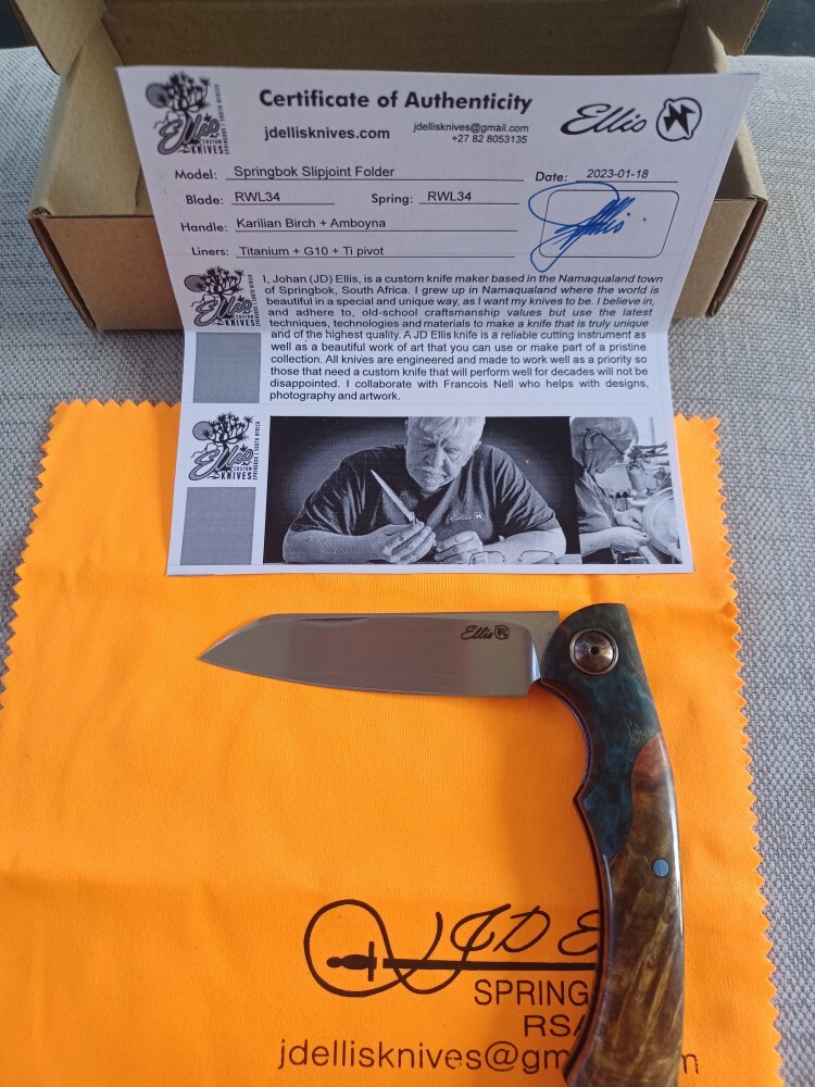 Johan Ellis Springbok...4",Karilian Bolsters..Amboyna scales...G10 and ...