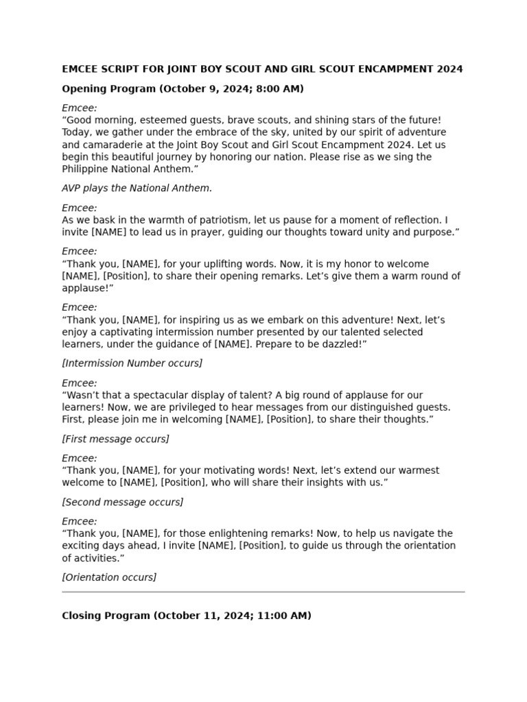 Emcee Script For Joint Boy Scout and Girl Scout Encampment 2024 | PDF