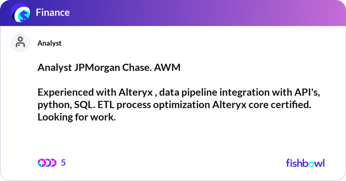 Analyst JPMorgan Chase. AWM Experienced with Alte... | Fishbowl