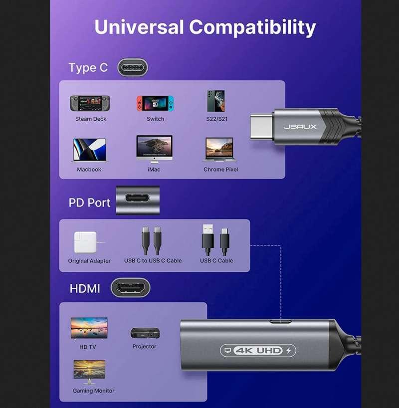 JSAUX USB C to HDMI Adapter and Charger for Steam Deck, 2-in-1 4K ...