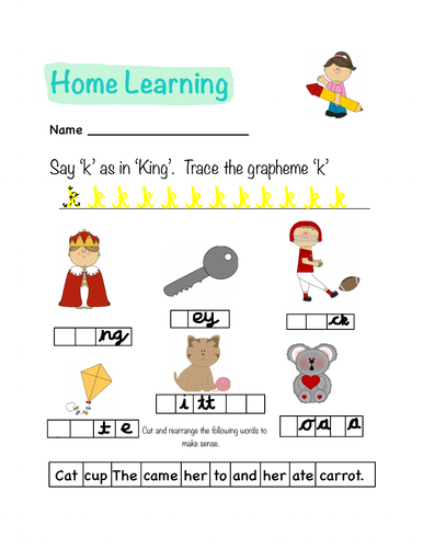 Phonics Letters and Sounds Homework Sheet (k) | Teaching Resources