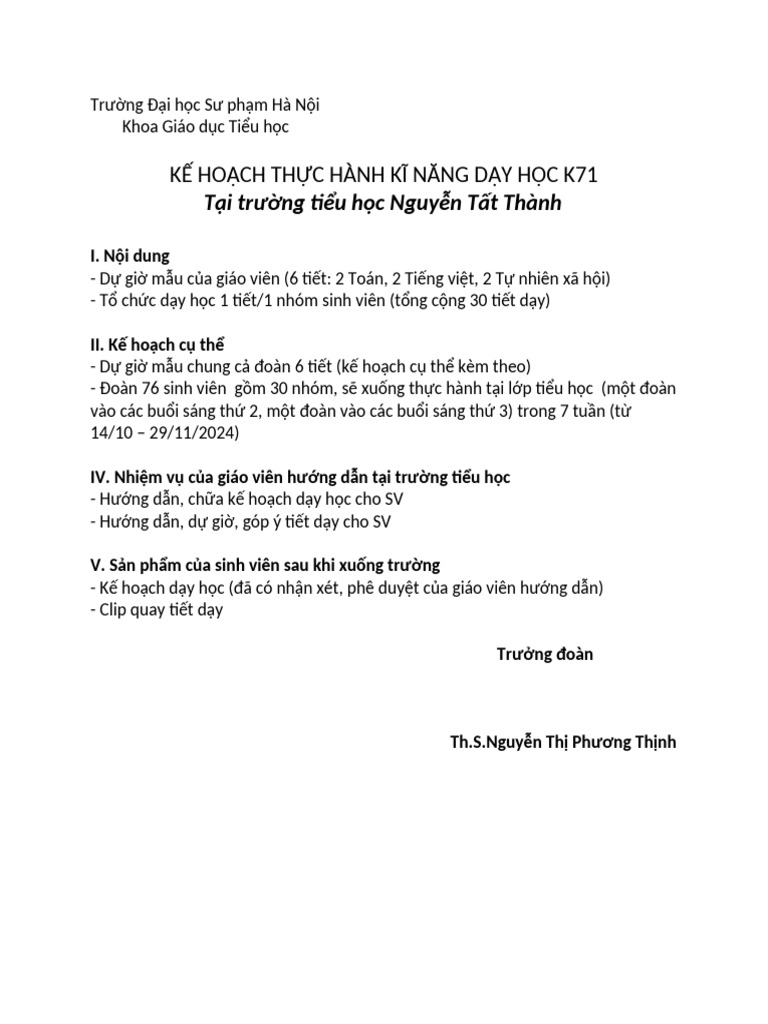 K71 - Kế hoạch xuống trường NTT | PDF