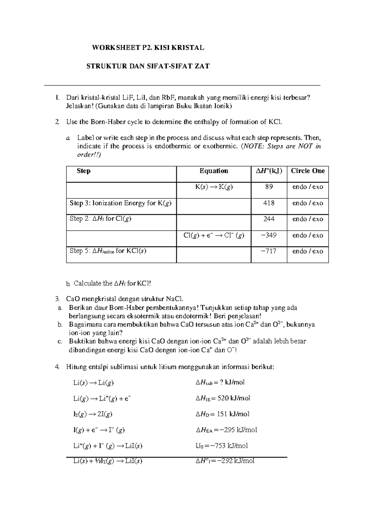 Worksheet P2: Energi Kisi dan Enthalpy Pembentukan KCl dan CaO - Studocu