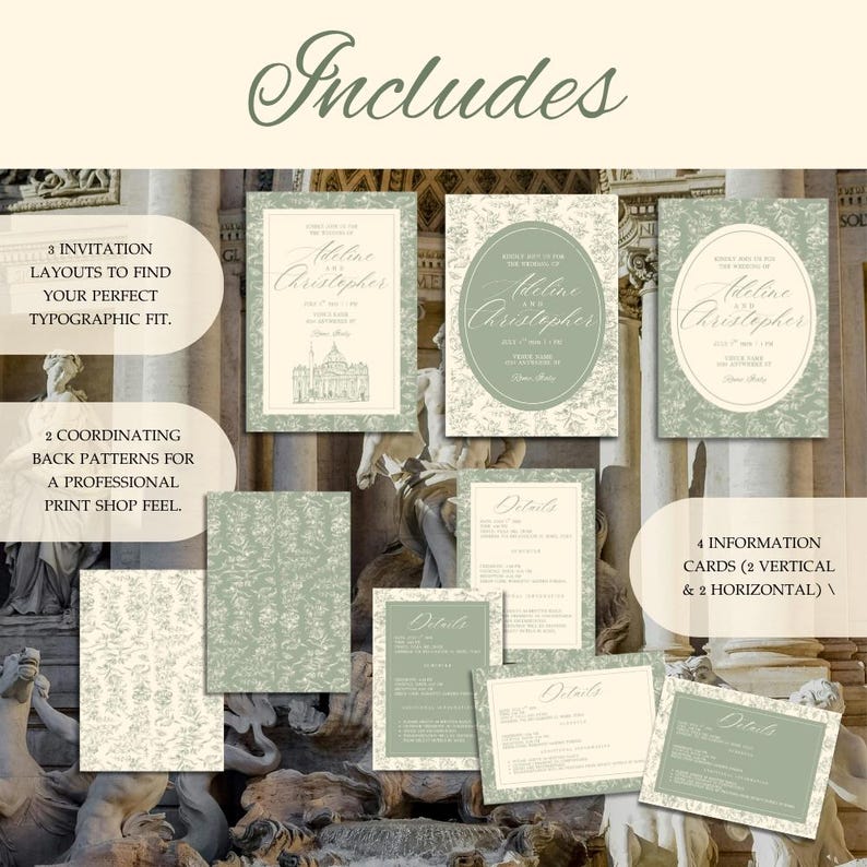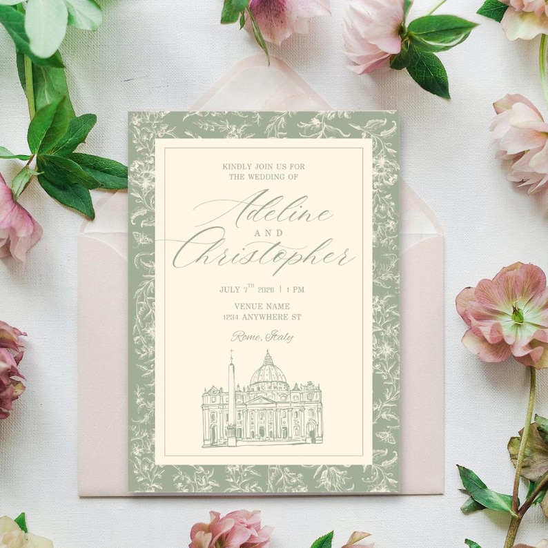 Botanical Wedding Invitation, Sage Green, Rome Destination, Editable ...