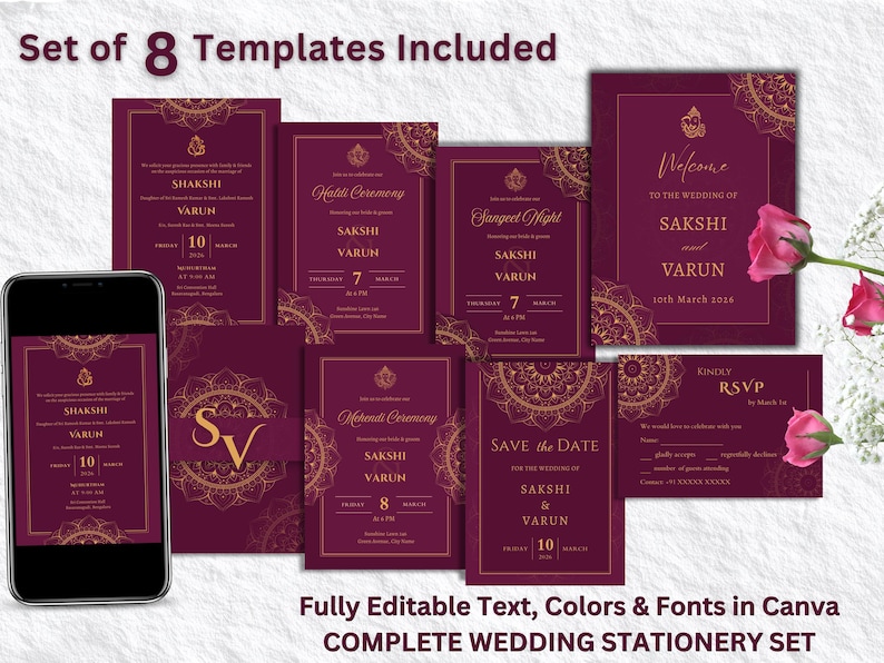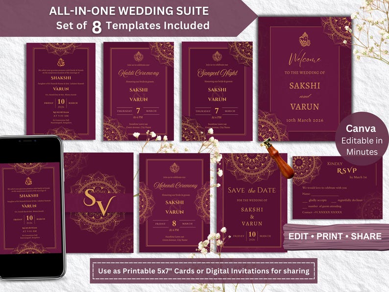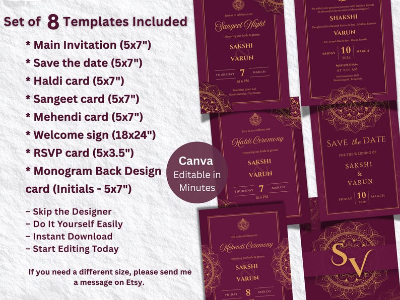 Indian Wedding Invitation Template Bundle, Editable Canva Invite Set ...