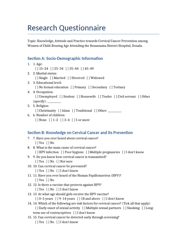 KAP Questionnaire Cervical Cancer Bonassama | PDF | Cervical Cancer ...