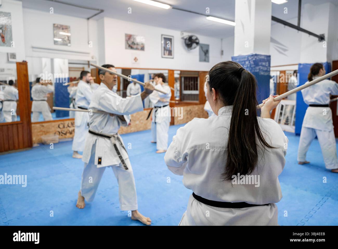 Young man practicing karate with a wooden weapon Stock Photo - Alamy