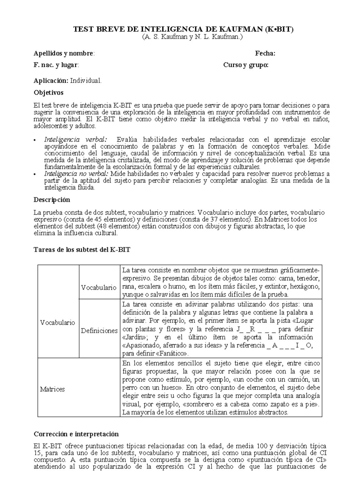 Ficha Técnica Test (K-BIT) - TEST BREVE DE INTELIGENCIA DE KAUFMAN (K ...