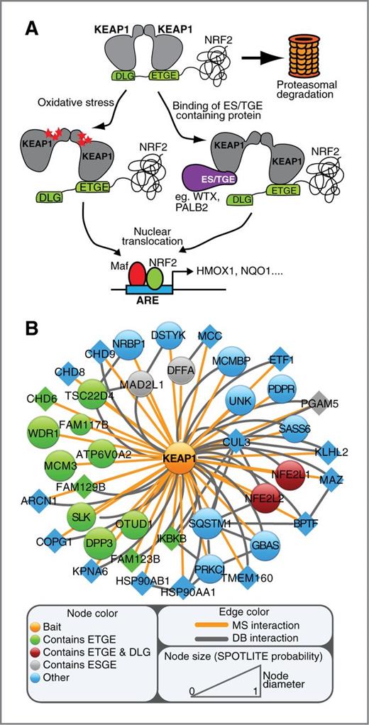 KEAP1 and NRF2. (A) Two KEAP1 molecules and one NRF2 form a trimer ...