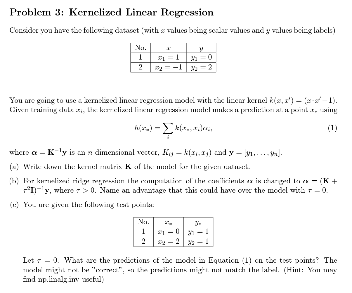 Solved Problem 3: Kernelized Linear Regression Consider you | Chegg.com