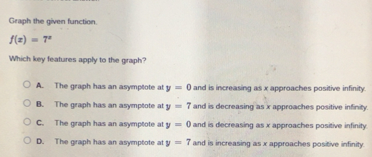 Solved: Graph the given function f(x)=7^x Which key features apply to ...