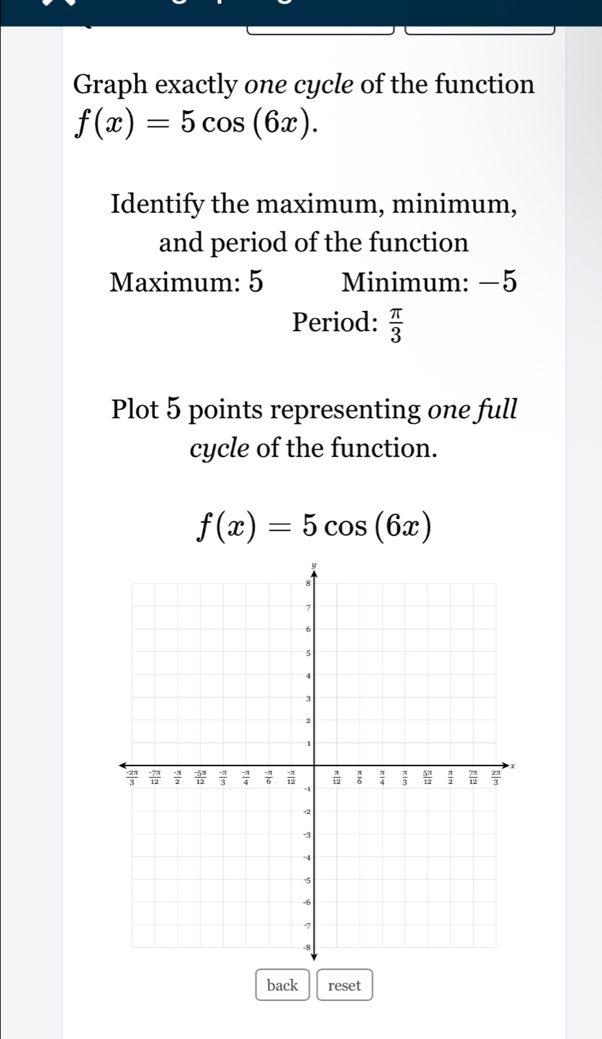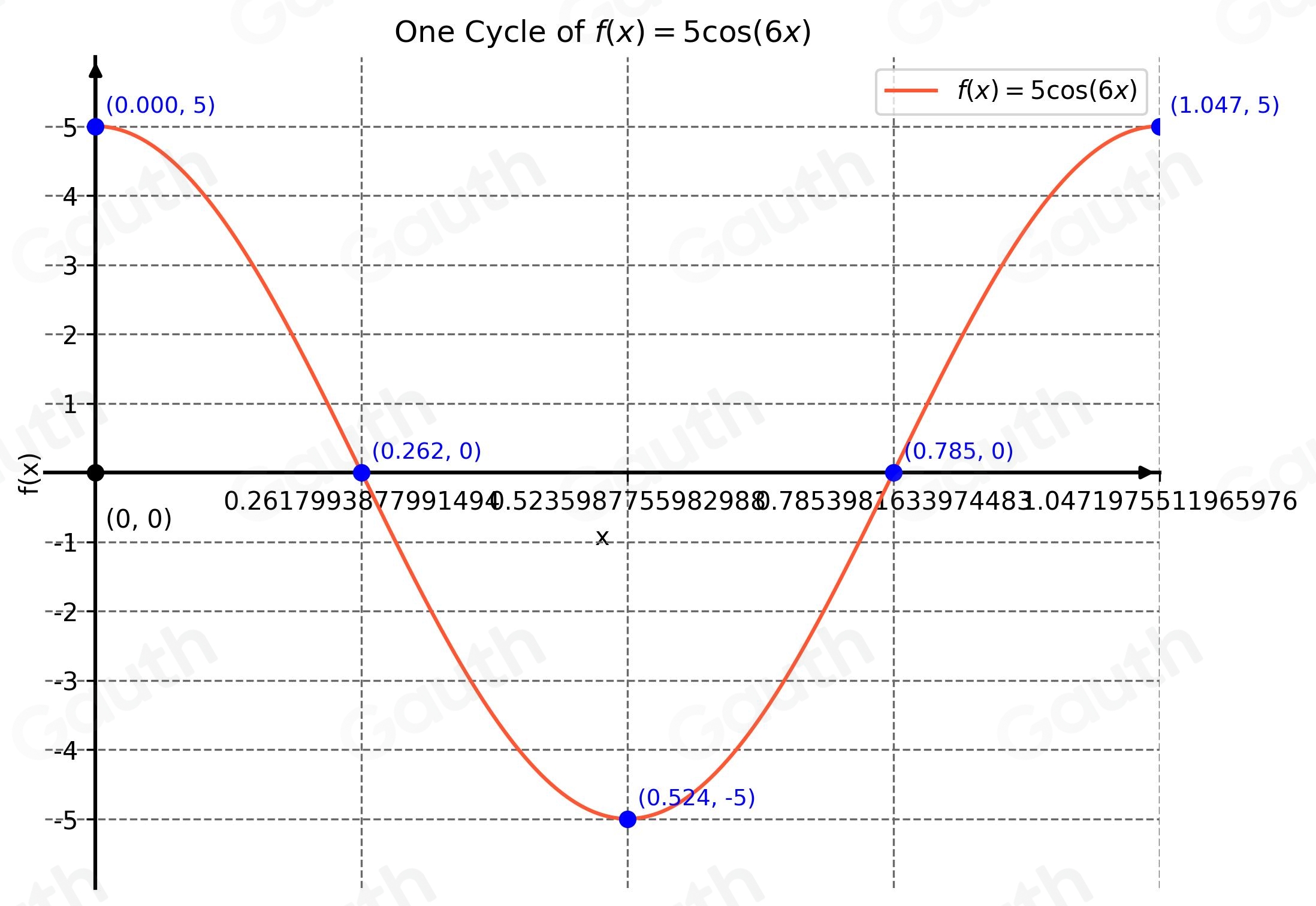 Solved: Graph exactly one cycle of the function f(x)=5cos (6x ...
