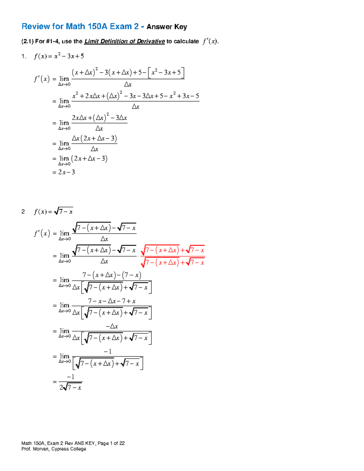 Math 150A Exam 2 Review Answer Key and Solutions - Studocu
