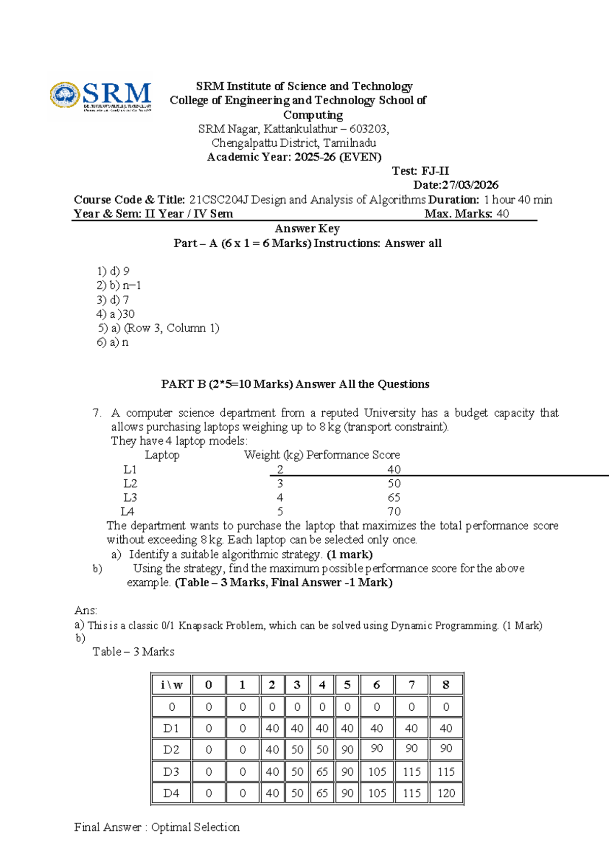 FJ-II Set A DAA - Answer Key for 21CSC204J Exam - Studocu