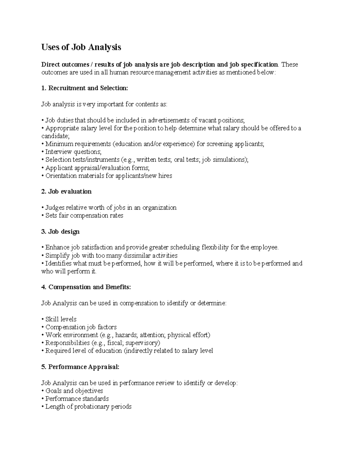 Job Analysis: Key Outcomes for HR Management and Productivity - Studocu