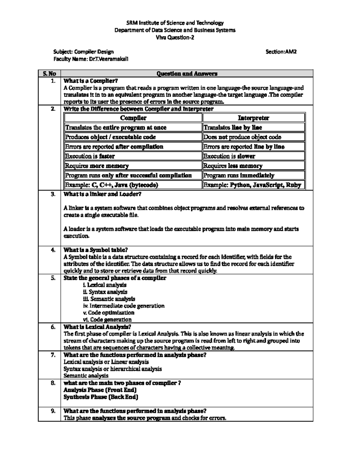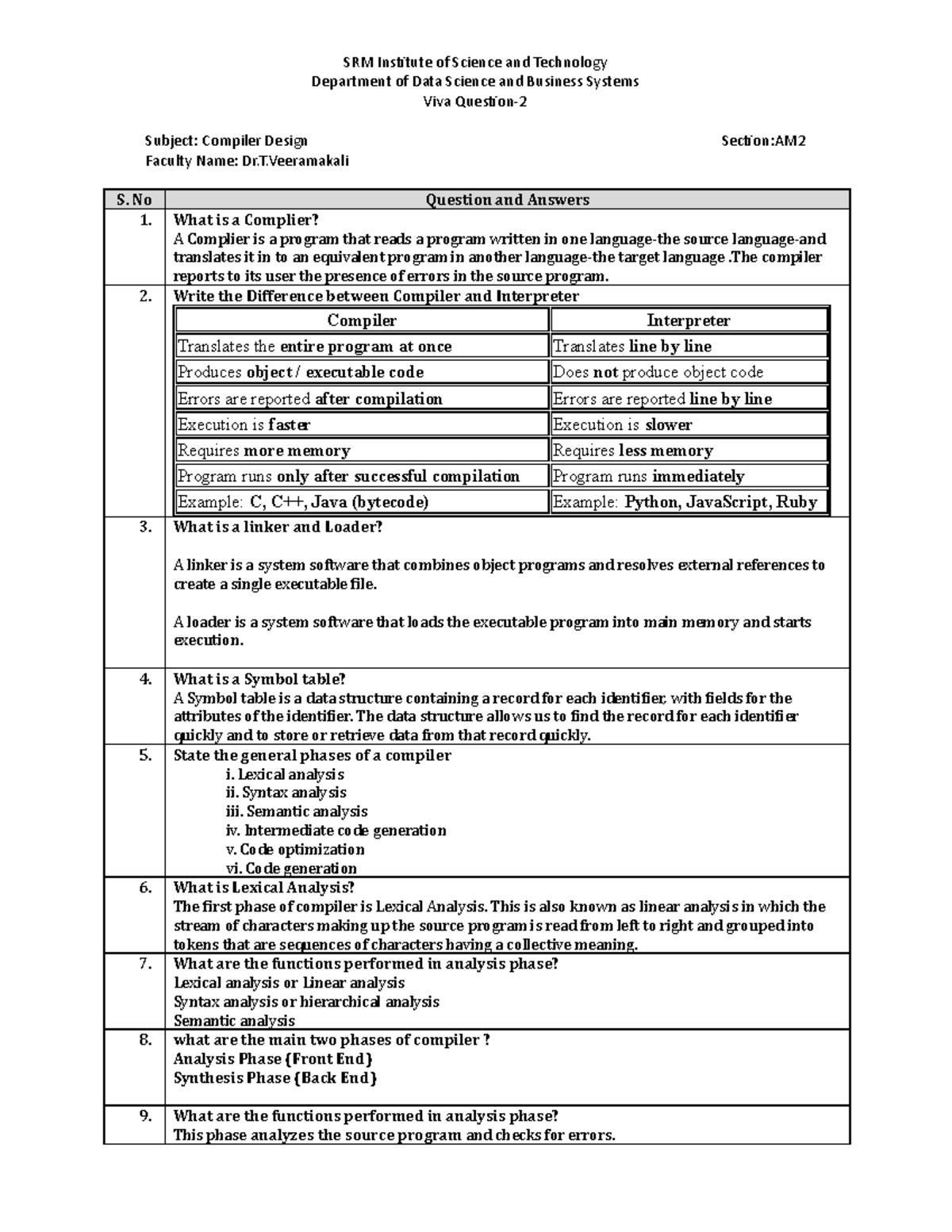 SRM Institute of Science and Technology Compiler Design Viva Q&A - AM2 ...