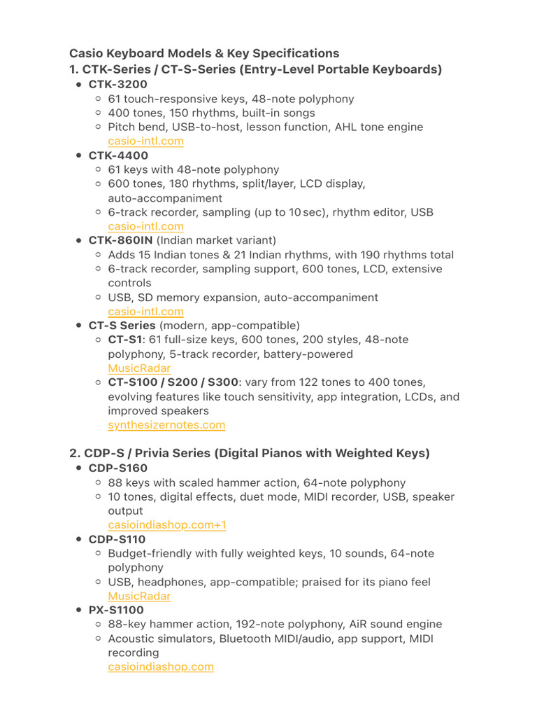 Casio Keyboard Models & Key Specifications | PDF | Piano | Sound Production