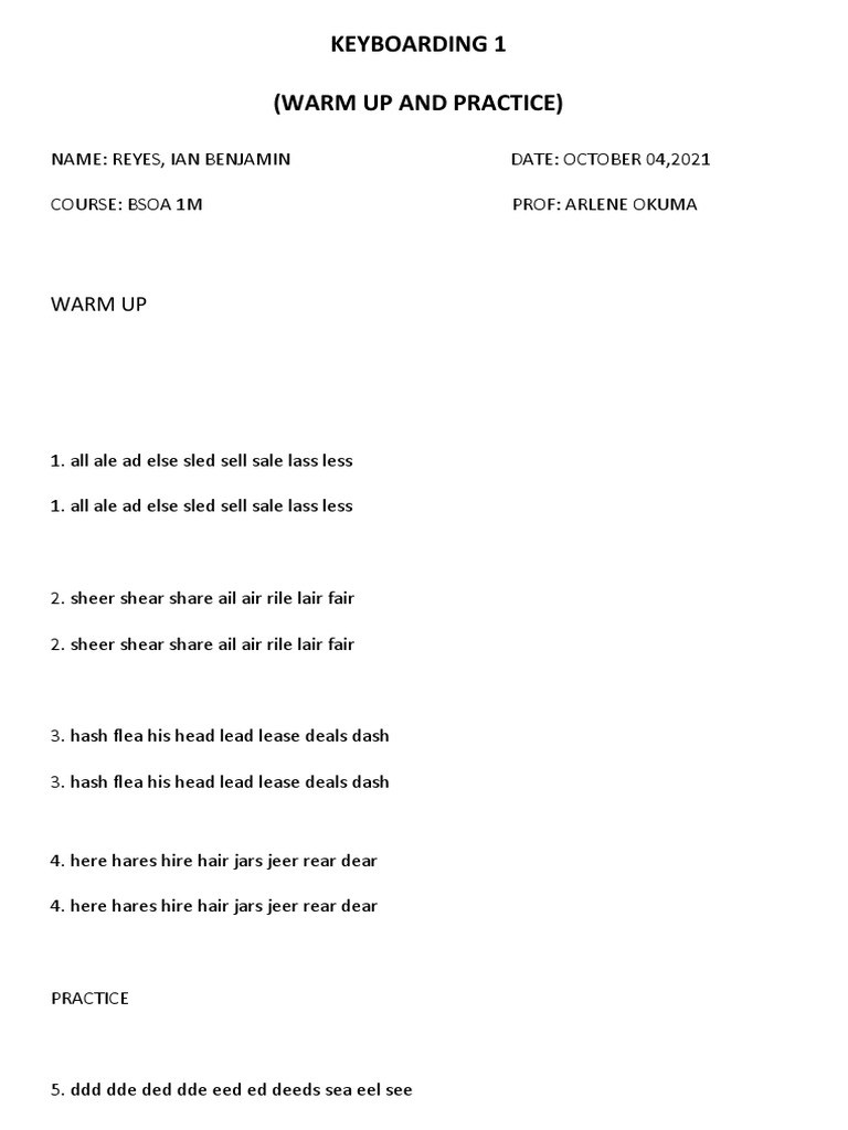 Keyboarding 1 (Warm Up and Practice) | PDF